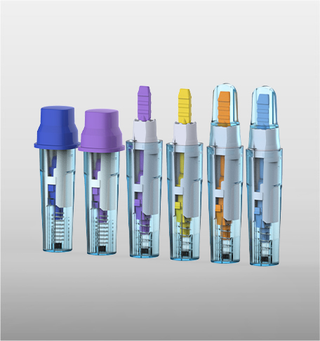 筒形采血筆OneStep型一步裝針,無(wú)需卸帽。 筒形采血筆OneStep型專(zhuān)配SoftSense型采血針,不通配市面上其他款式采血針。